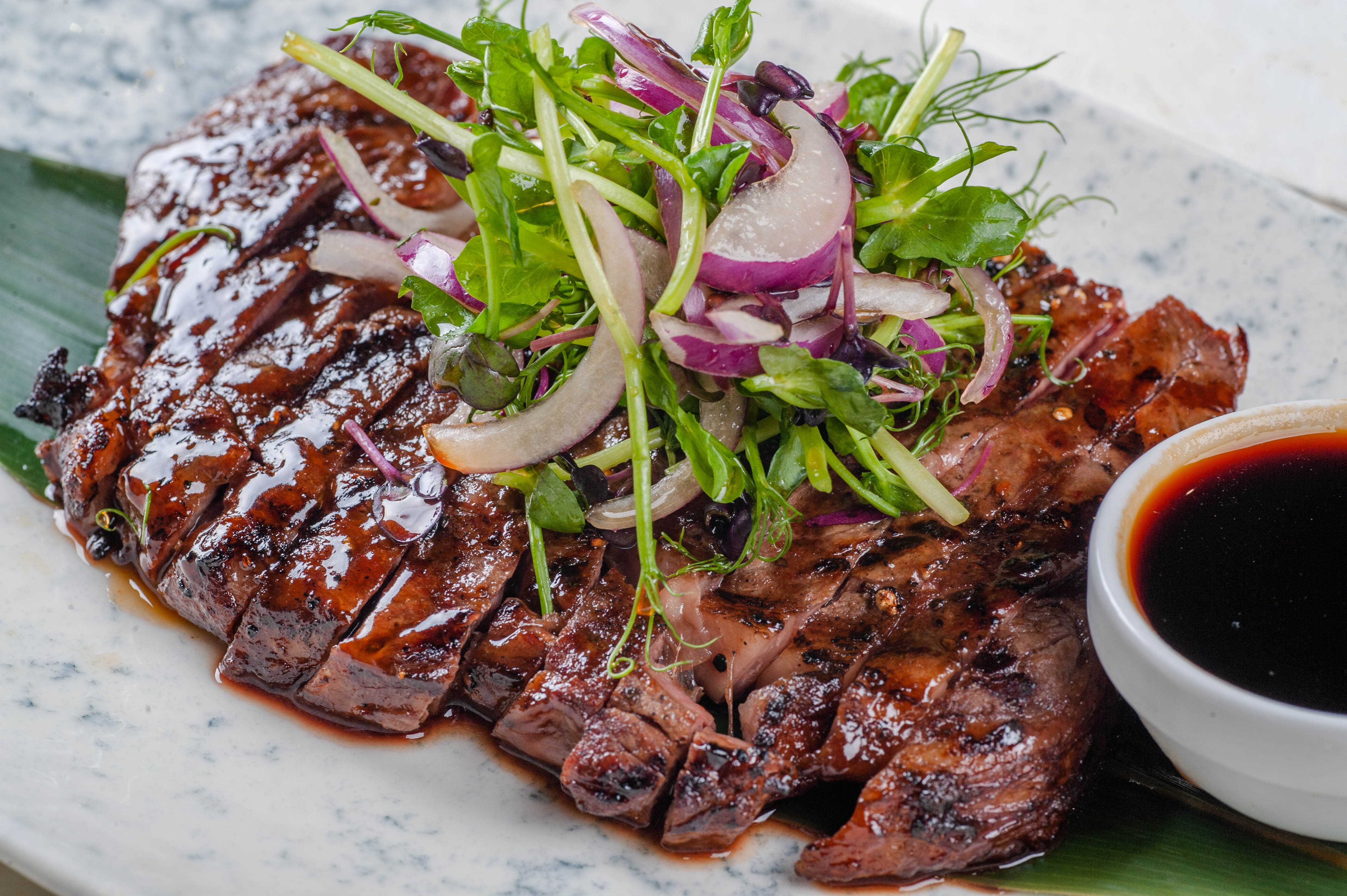 Состав: стейк рибай, соус чили-терияки, кресс салат-горох, лук красный, соус вок
